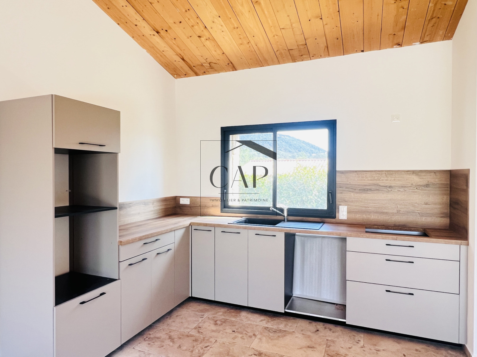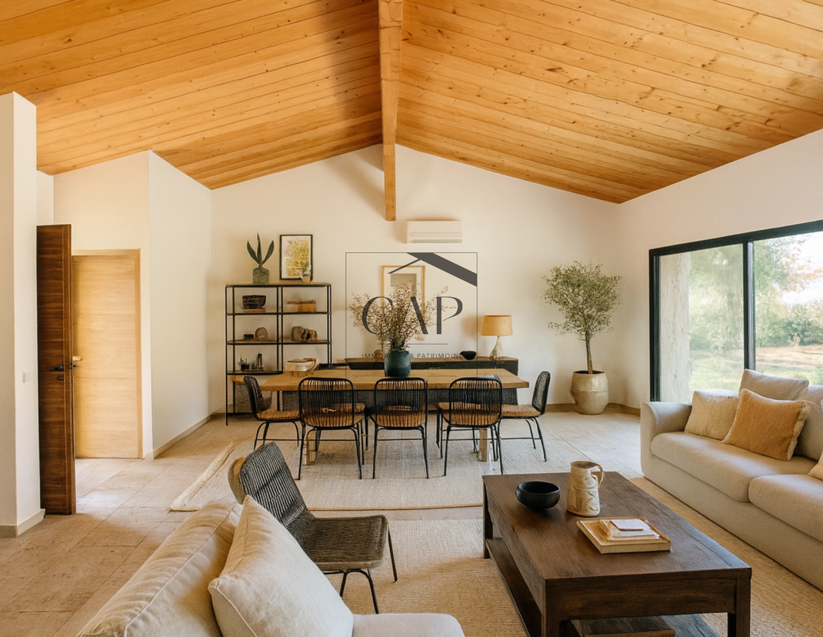CAP Immobilier & Patrimoine VOUS PROPOSE une superbe villa neuve, individuelle en pierre / bergerie, de plain pied type T3, située dans un cadre idyllique et calme. Spacieuse, d’une surface de 84 m², cette propriété s’étend sur un terrain paysagé de plus de 630m² avec une exposition plein Sud.