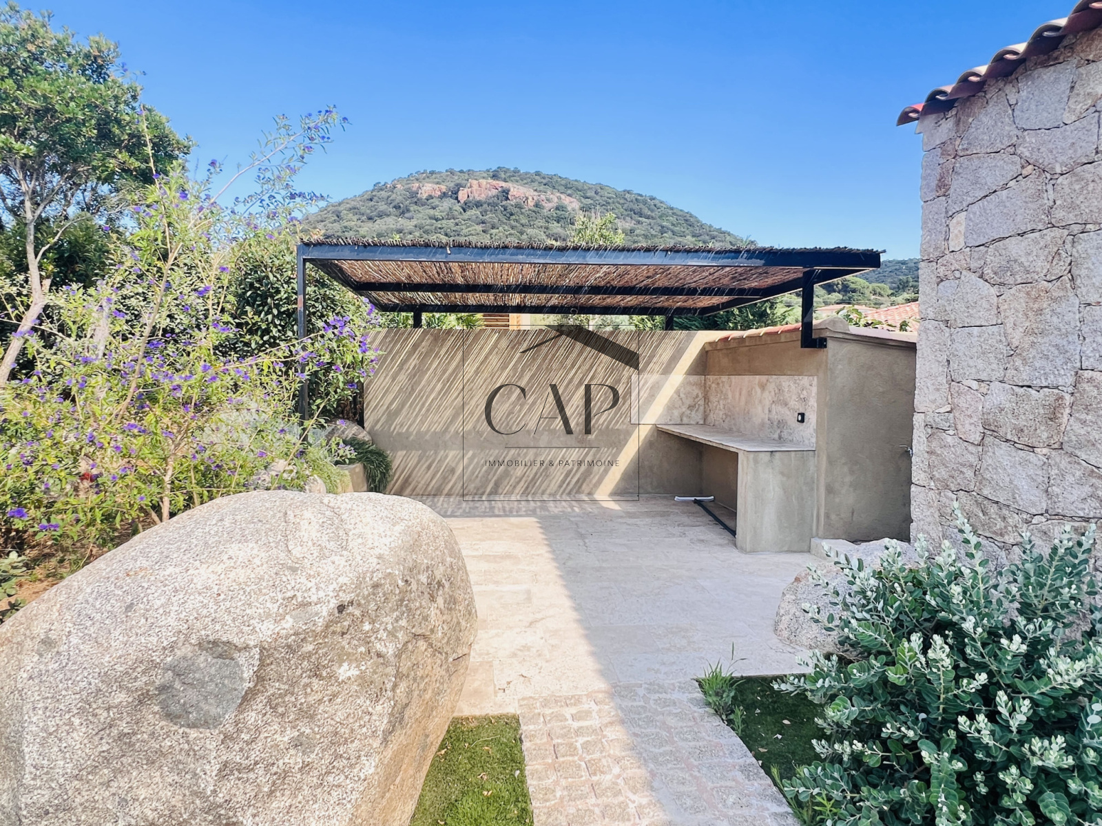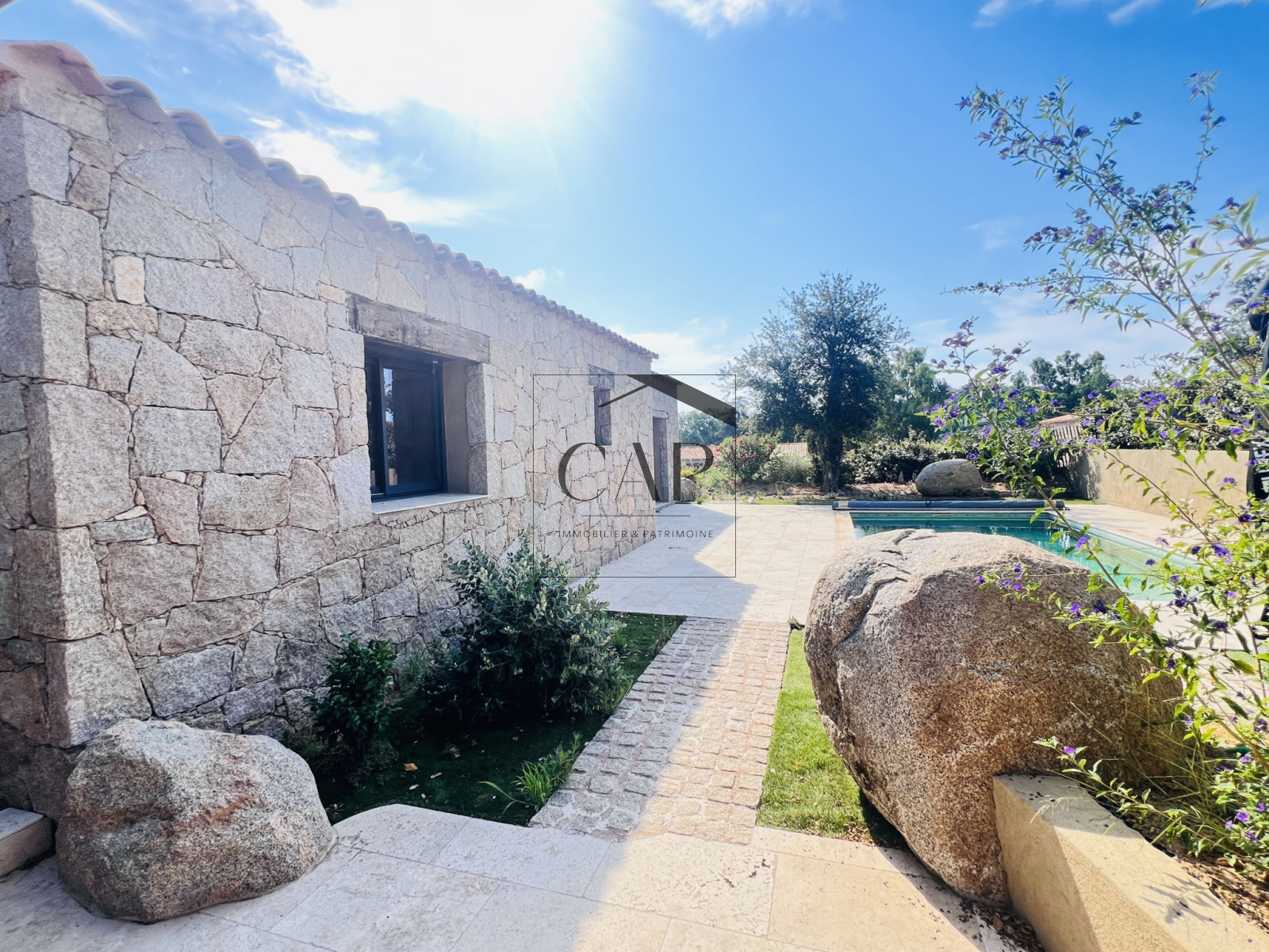 Outdoors, enjoy a private heated pool, a 60 m² terrace, summer kitchen and pétanque court, all set in a peaceful environment between the sandy beaches of Saint-Cyprien, Cala Rossa and Pinarello, and the Alta Rocca mountains.