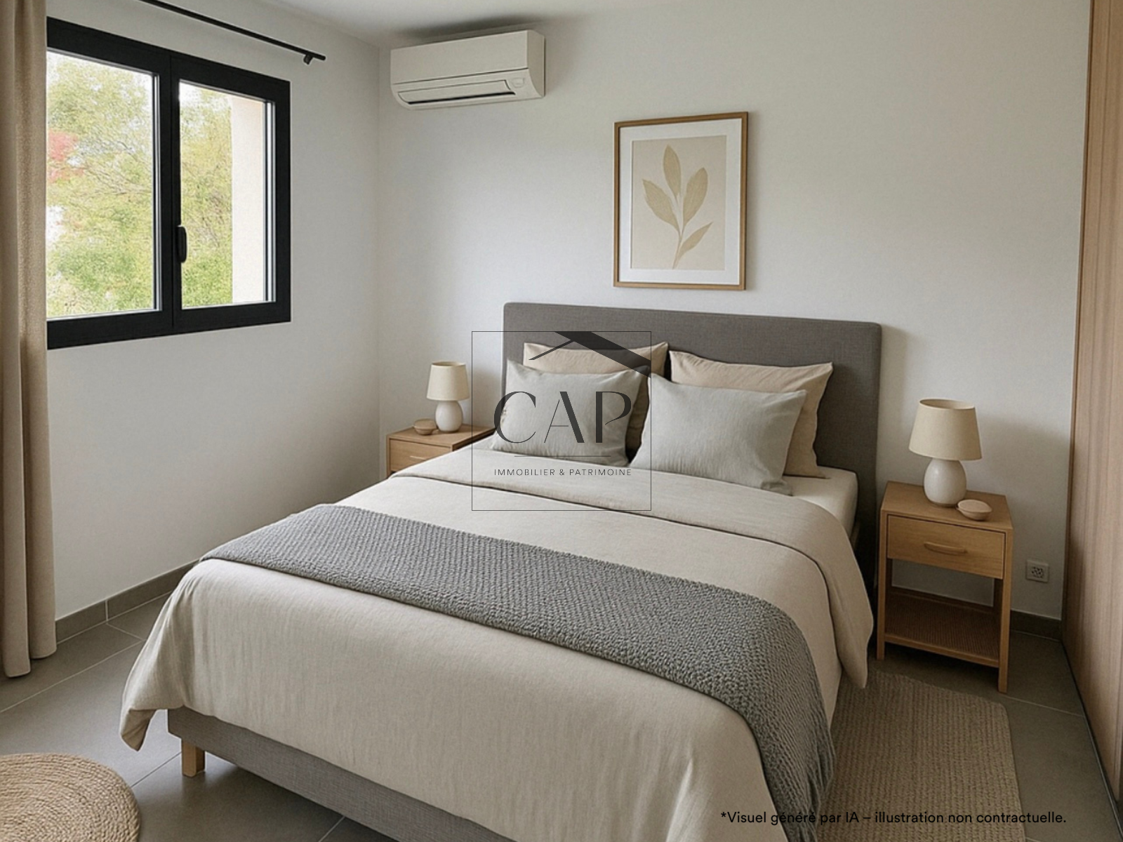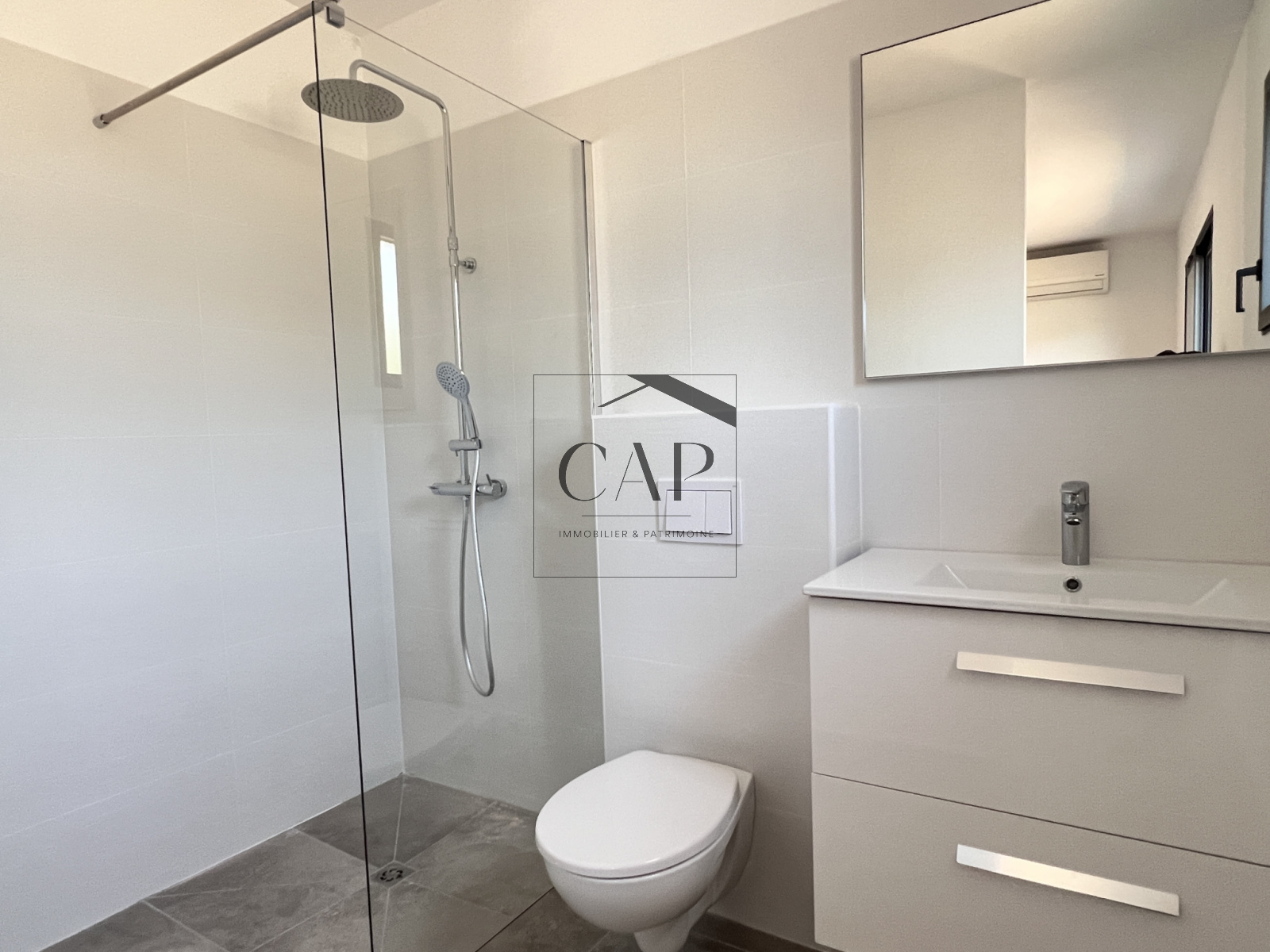 Construction neuve conforme à la RT 2012, menuiseries aluminium double vitrage, carrelage grand format, ballon thermodynamique.