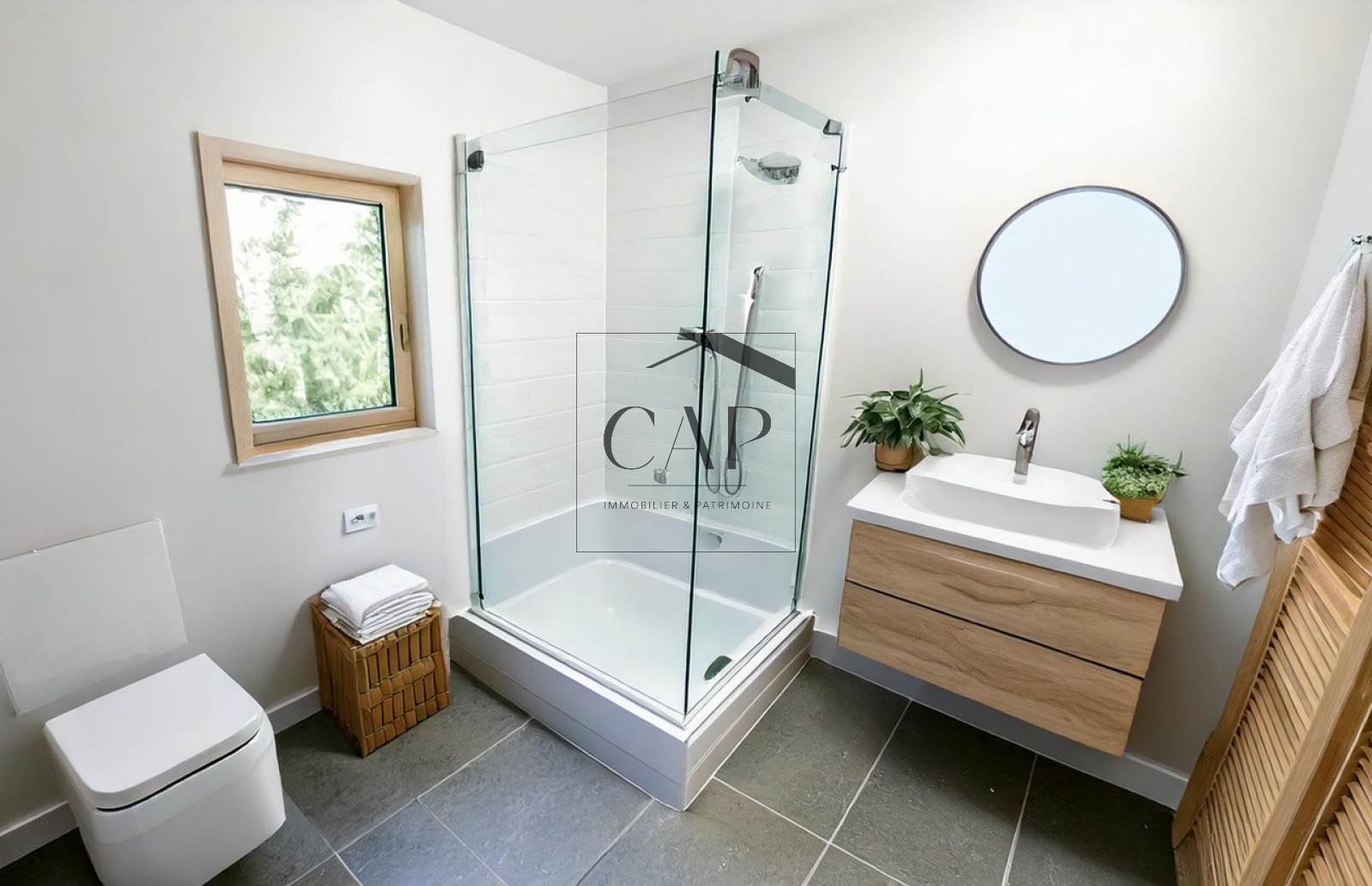 Prestations soignées : carrelage grand format, volets roulants motorisés