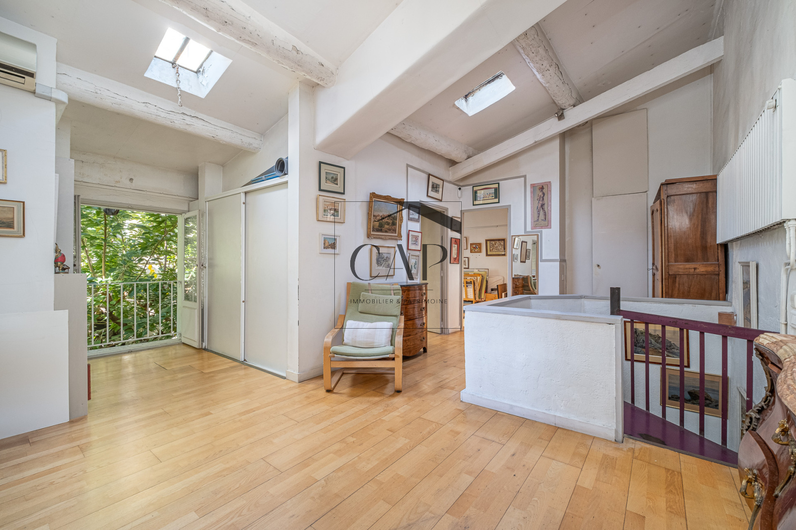 À l’étage : une chambre actuellement aménagée en atelier de peinture, un bureau, une salle de bain, un WC et un espace nuit en mezzanine. Un volume en inter-sol comprend un dressing.