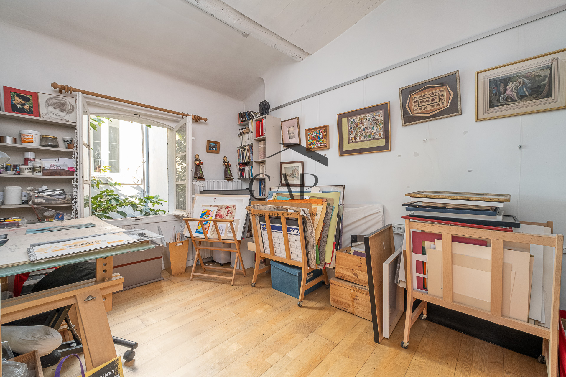 L’atelier, également en rez-de-chaussée et exposé sud-est, développe une surface d’environ 34 m² au sol (23 m² Carrez) et bénéficie d’une mezzanine.