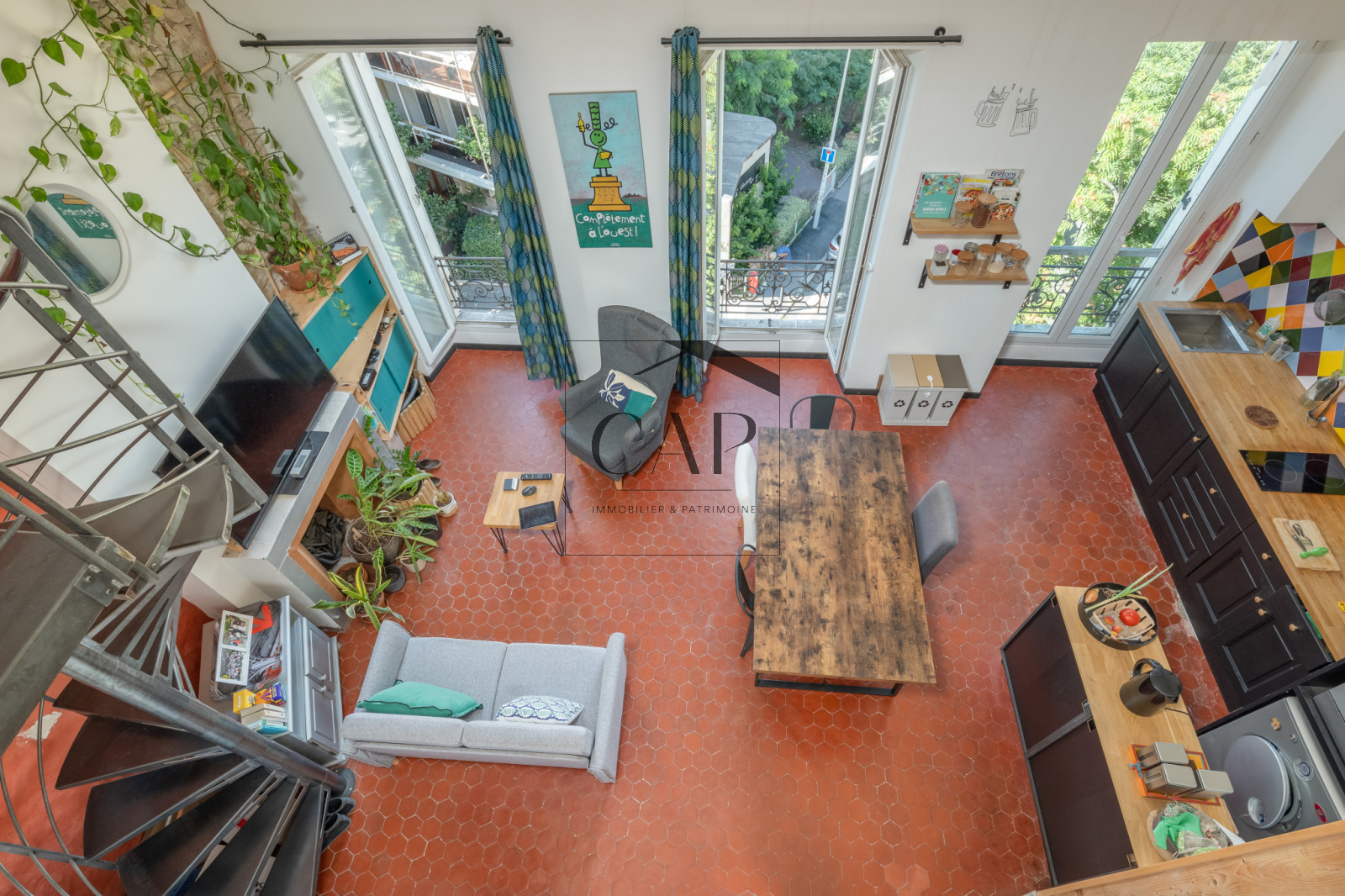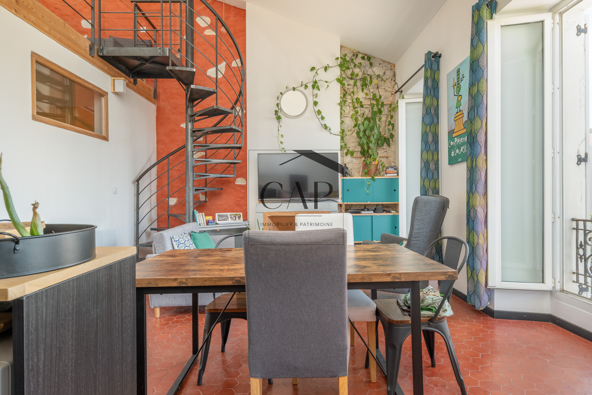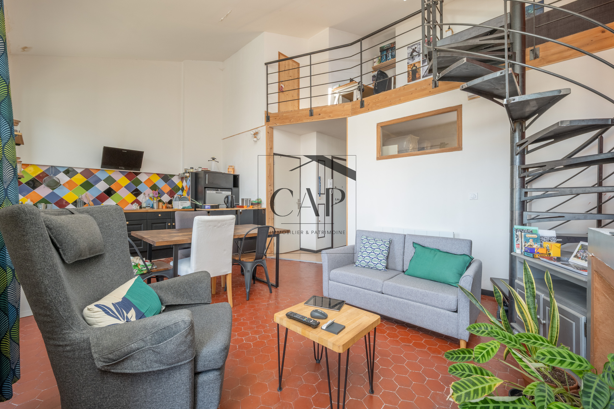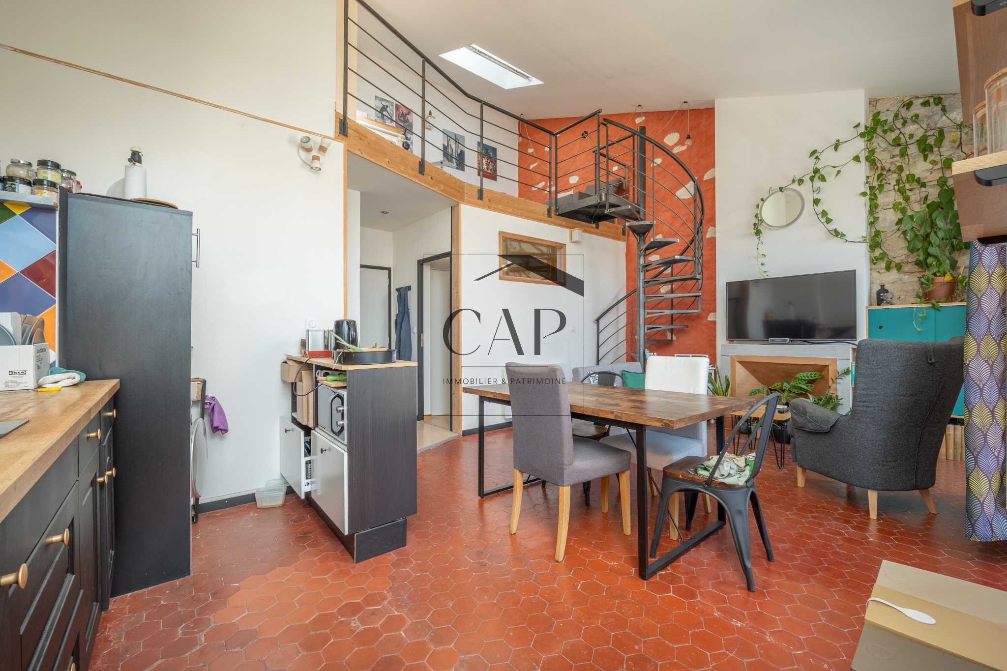 Hall d’entrée, grande pièce de vie aux beaux volumes avec cuisine ouverte et îlot. Un escalier en fer forgé conduit à la mezzanine, un espace lumineux pouvant servir de chambre d'ami et/ou de bureau. Une chambre indépendante. Salle d’eau avec grand bac à douche. WC suspendu séparé.
