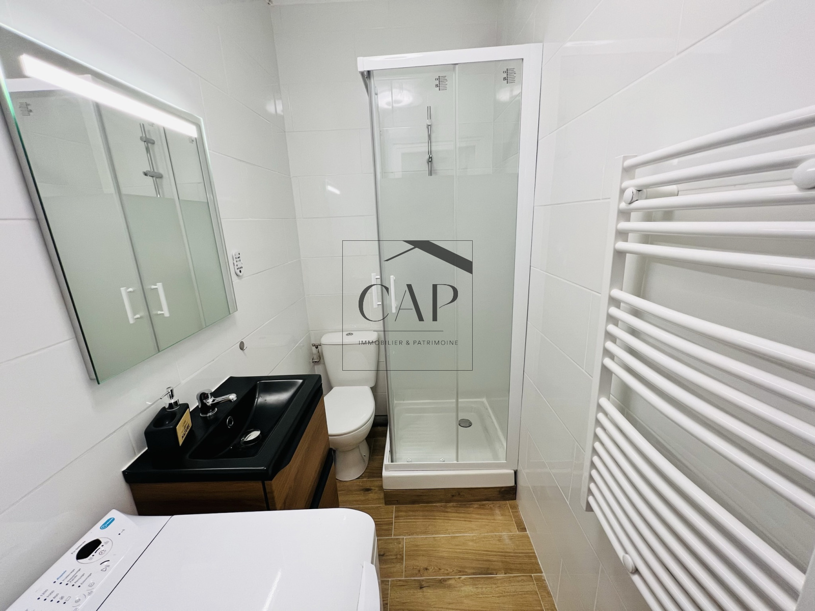 La salle d’eau moderne comprend une douche, un WC, un lave-linge et un sèche-serviettes.