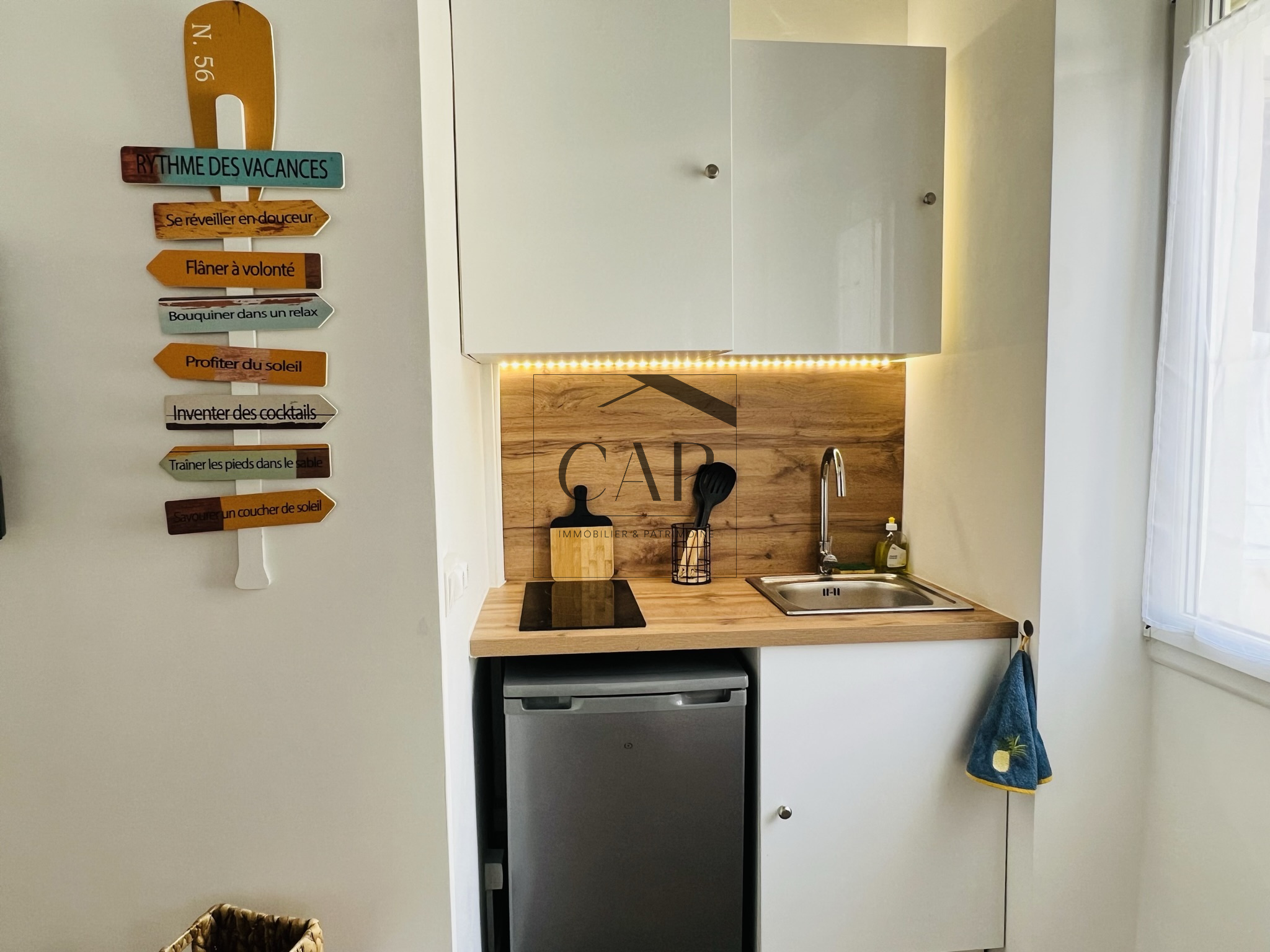 Le studio se compose d’une entrée avec rangements, d’une pièce de vie confortable équipée d’un canapé-lit 160 cm avec matelas haut de gamme, ainsi que d’un espace repas type comptoir.