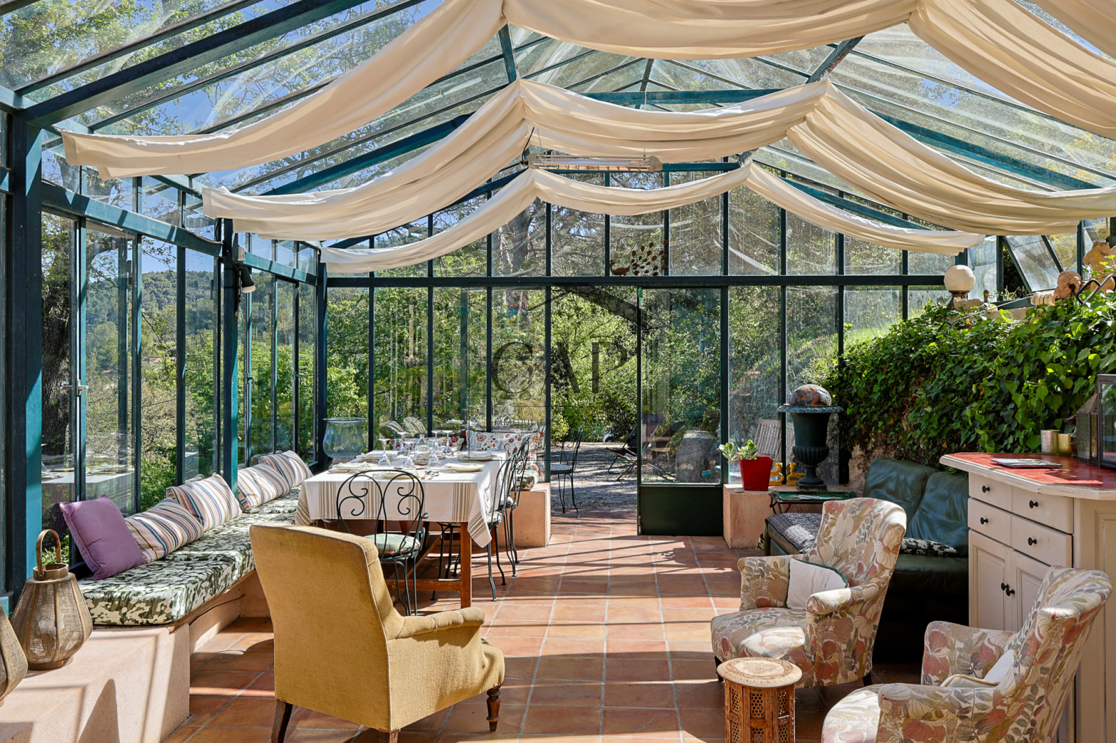 It includes a living room with fireplace, extended by a glass veranda, opening onto the outdoors.