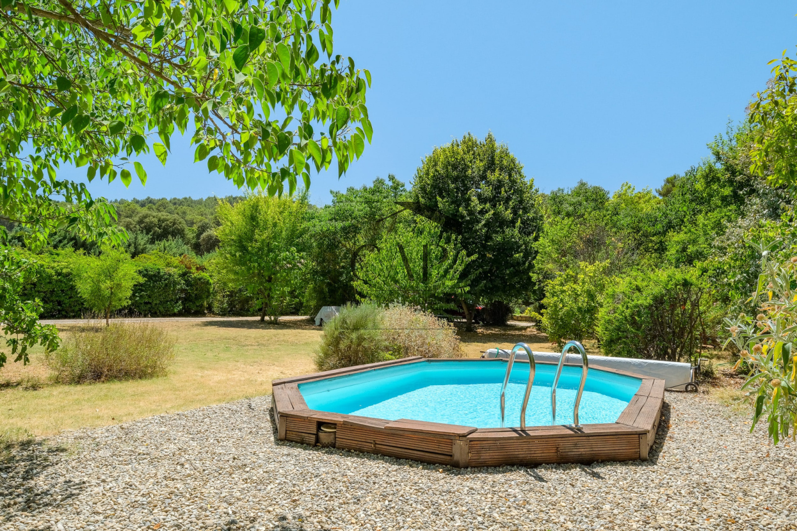 L’espace extérieur comprend un vaste terrain plat et arboré au calme, de belles terrasses, une piscine hors-sol, et un carport.