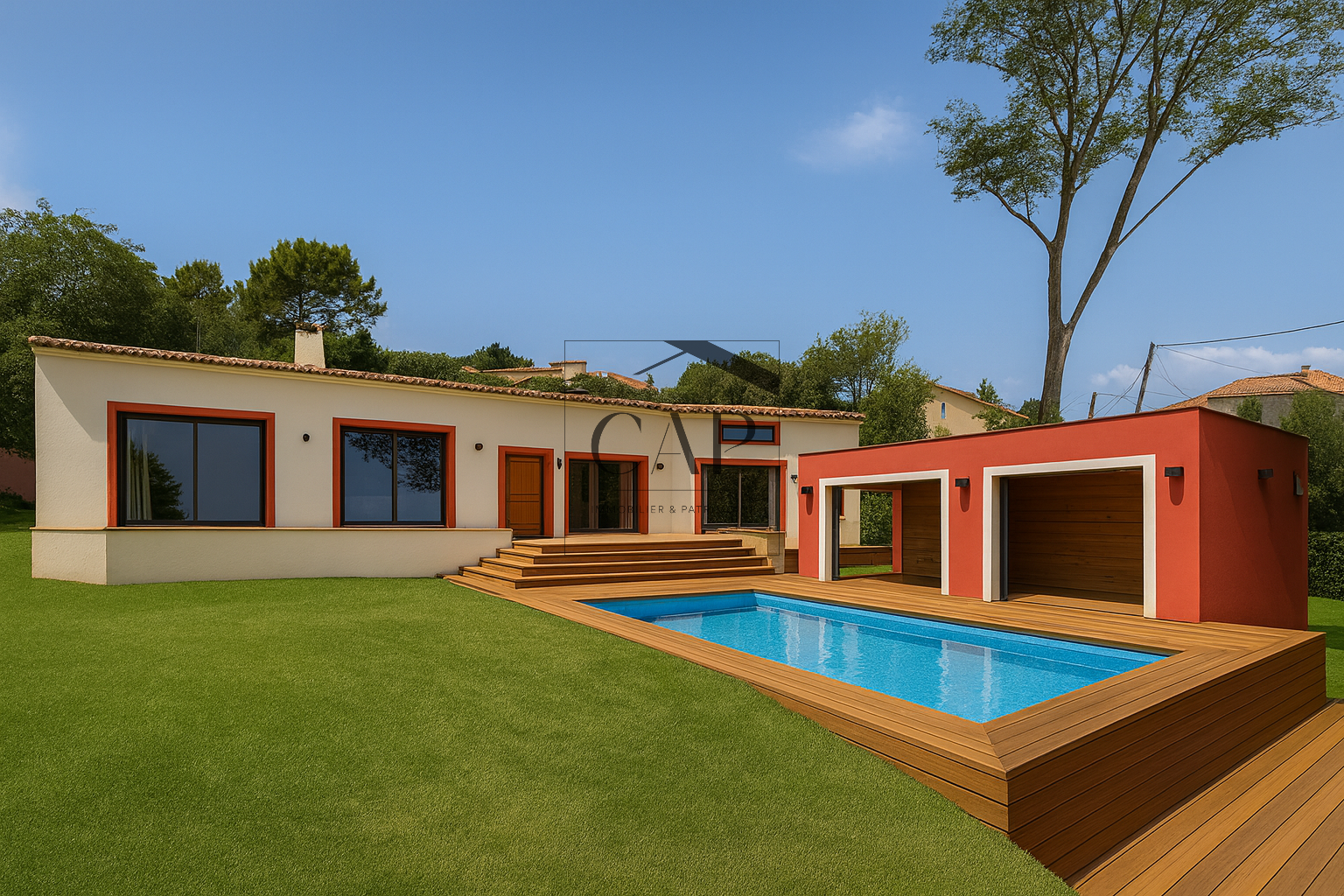DESCRIPTION DÉTAILLÉE : Cette villa de plain-pied offre 196,13 m² habitables et près de 223 m² de surface au sol. Un plan en étoile permet un agencement fonctionnel et harmonieux : séjour spacieux ouvert sur une cuisine US, 3 chambres dont 2 suites avec salle d’eau et WC, et un poolhouse indépendant avec salle d’eau, WC et chambre d'amis. Une mezzanine (30 m² non compris dans la superficie habitable) complète ce bien d’exception. La propriété dispose également d’un garage de 15 m².