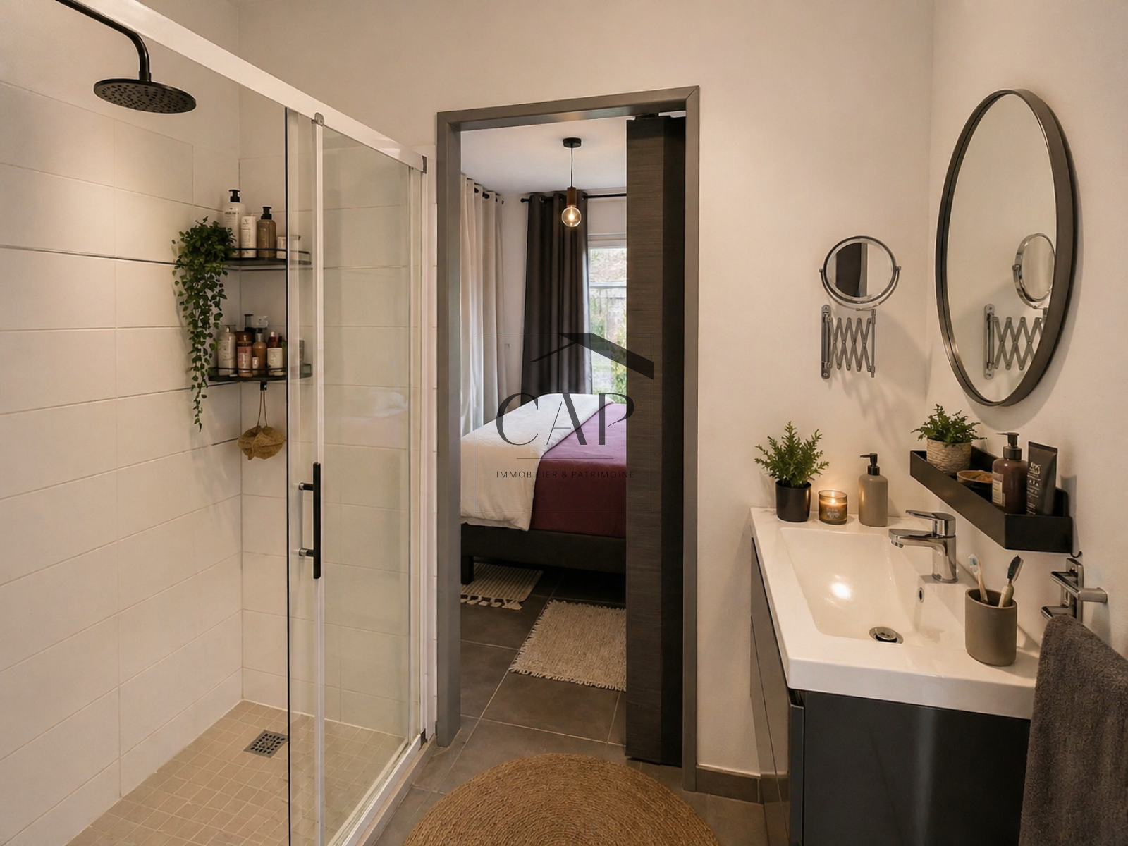 L’espace nuit comprend deux chambres avec rangements ainsi qu’une salle d’eau avec douche à l’italienne et WC indépendant.