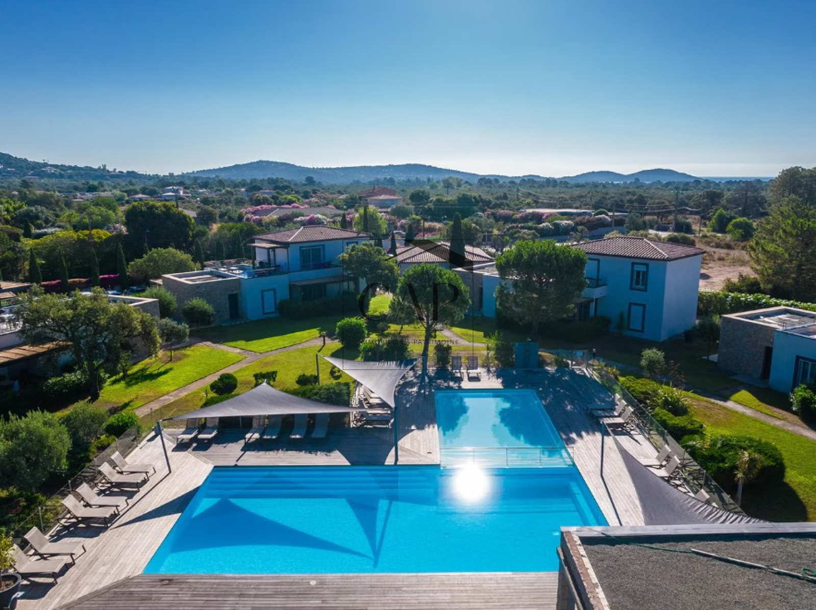 Espaces verts entretenus, terrasse ombragée, trois piscines extérieures dont une chauffée.