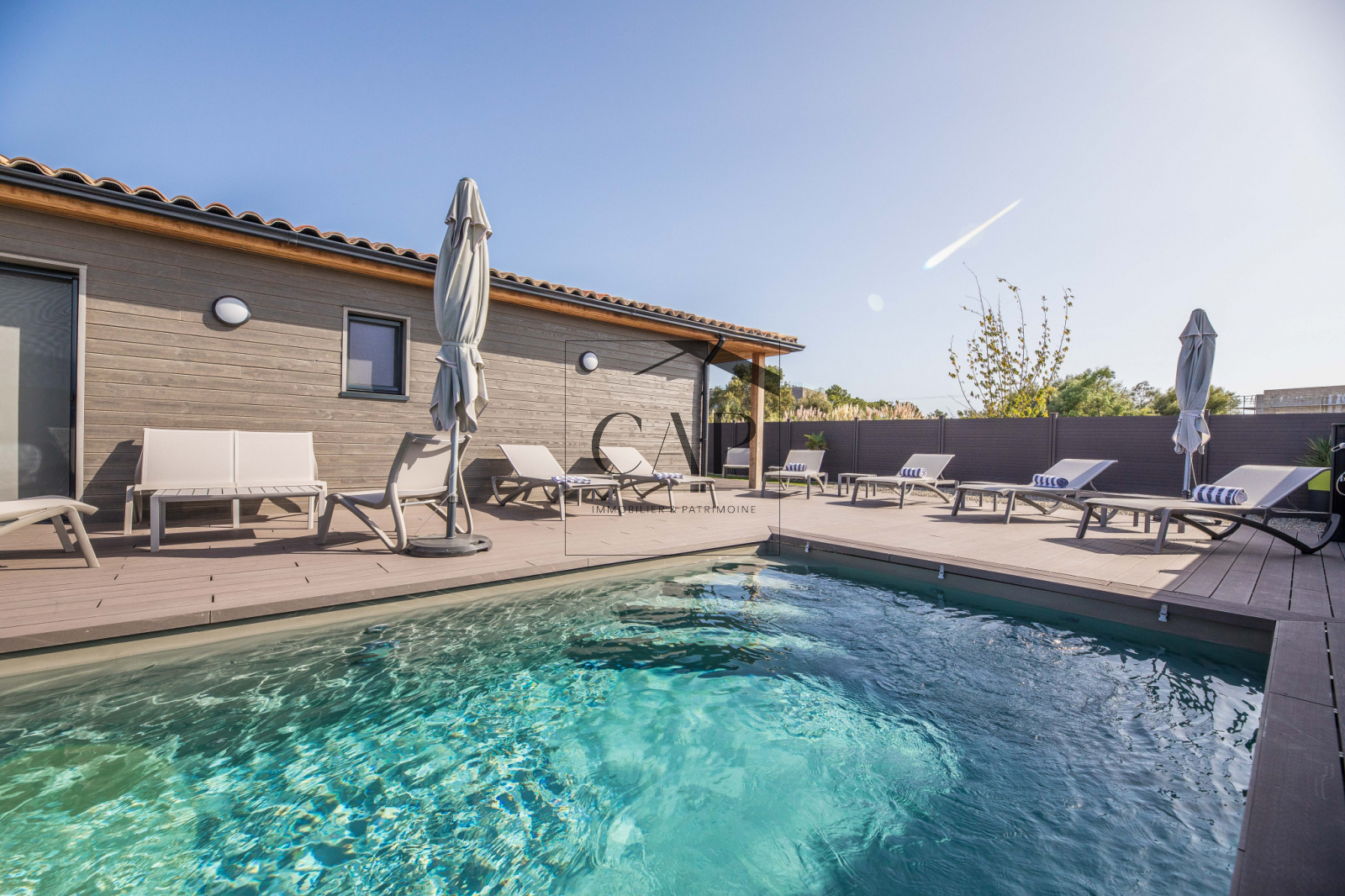 Magnifique villa T4 de luxe 5 étoiles pour une surface de 96m², 3 grandes suites parentales, piscine privée chauffée et grande terrasse et jardin de plus de 170m² au total.